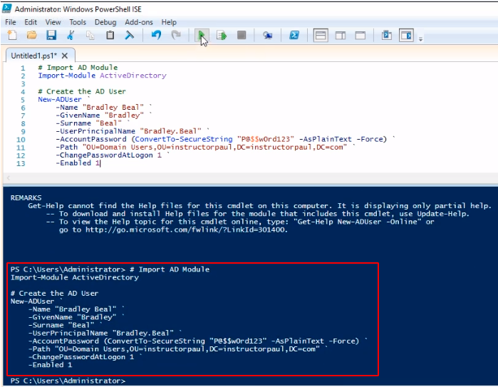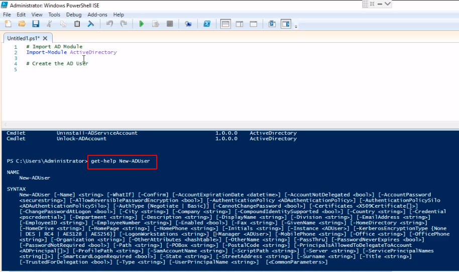 Let’s start by typing the Comment and Import the Active Directory Module.Since we are creating AD Users, we can type get-help New-ADUser to see all the options we can use.