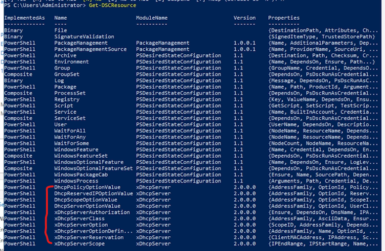 Now when you run “Get-DSCResource”, you will see the resources included with the “xDhcpServer” DSC resource: