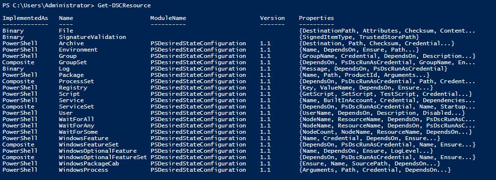 It will return the following resources that we can modify to configure our network nodes and servers. The list is great, but we will install the PowerShell DSC Resource Kit which will massively extend our DSC capabilities.