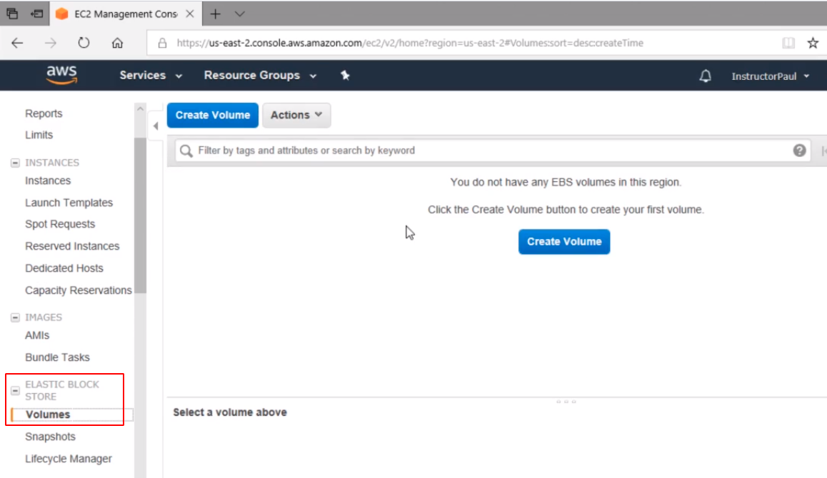 If it doesn’t give you that Warning message saying it wasn’t going to terminate the volume then what we want to do is scroll down from the left menu and under Elastic Block Storage, and this is what EBS stands for, we click Volumes and right here is where you see it but right now it has already been deleted, but if that was not the case we would see the root drive for the VM listed here.