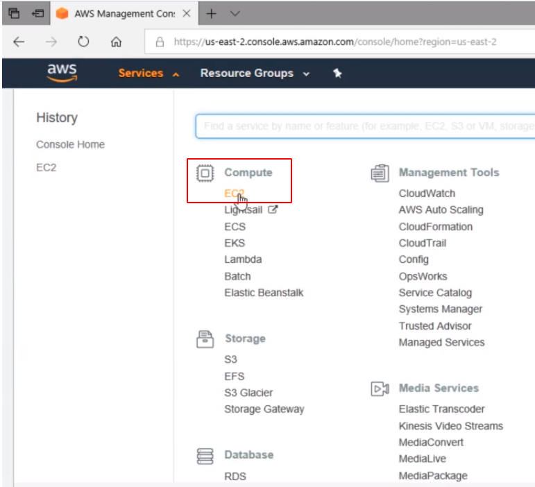 So, what we are going to do is at the Dashboard we click on Services, and under Compute click on EC2.