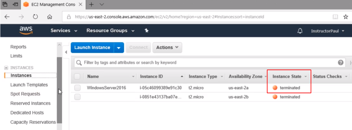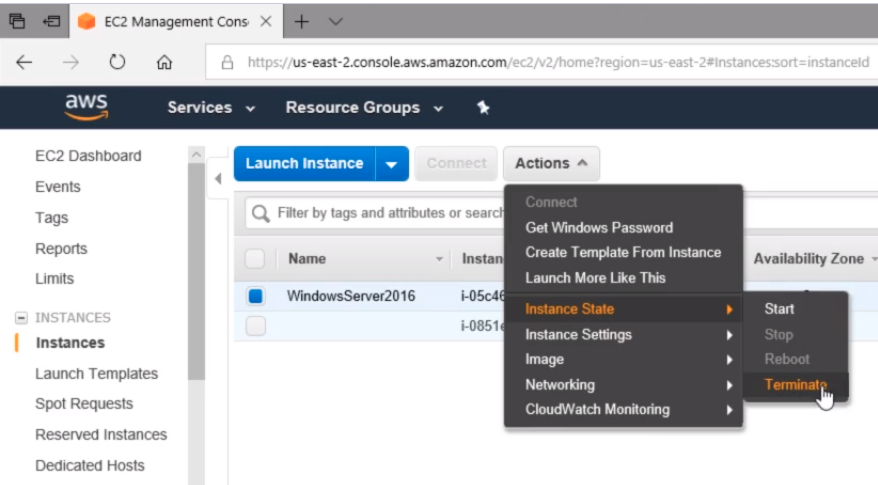 I am now going to select the Windows Server 2016 instance and choose Actions from the drop-down menu and select Instance State and select Terminate.