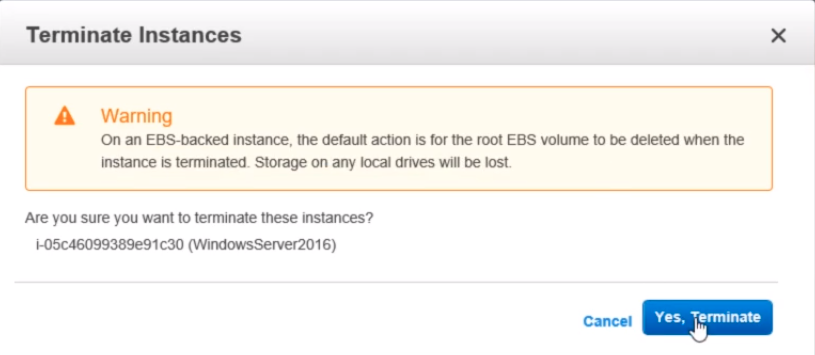 A popup warning message appears telling us that the instance will be deleted. If the EBS volume is not deleted we are going to still be using that storage, meaning we could still be charged. Click the Yes, Terminate button.
