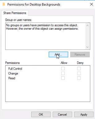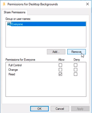 - By default, Everyone has Read permissions. To be a little bit more secure let’s delete the group by highlighting Everyone group and clicking on the Remove button.