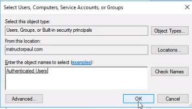 - Type in the Authenticated Users name and click on the Check Names button to resolve the name. If it is underlined it should be fine and click the OK button.