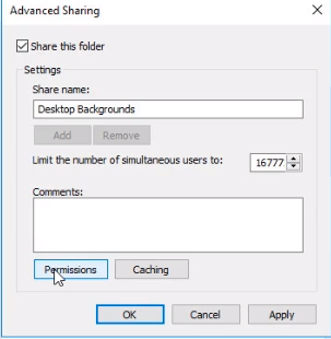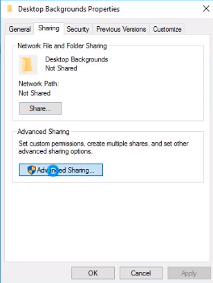 - Under the Desktop Background Properties Window select the Sharing Tab and click on the Advanced Sharing button.
