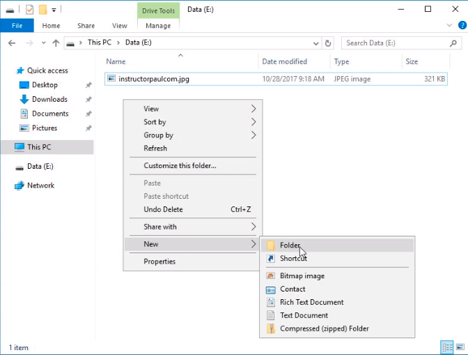 - Right-click on Windows Explorer under the E:\ drive and choose to create a New > Folder.