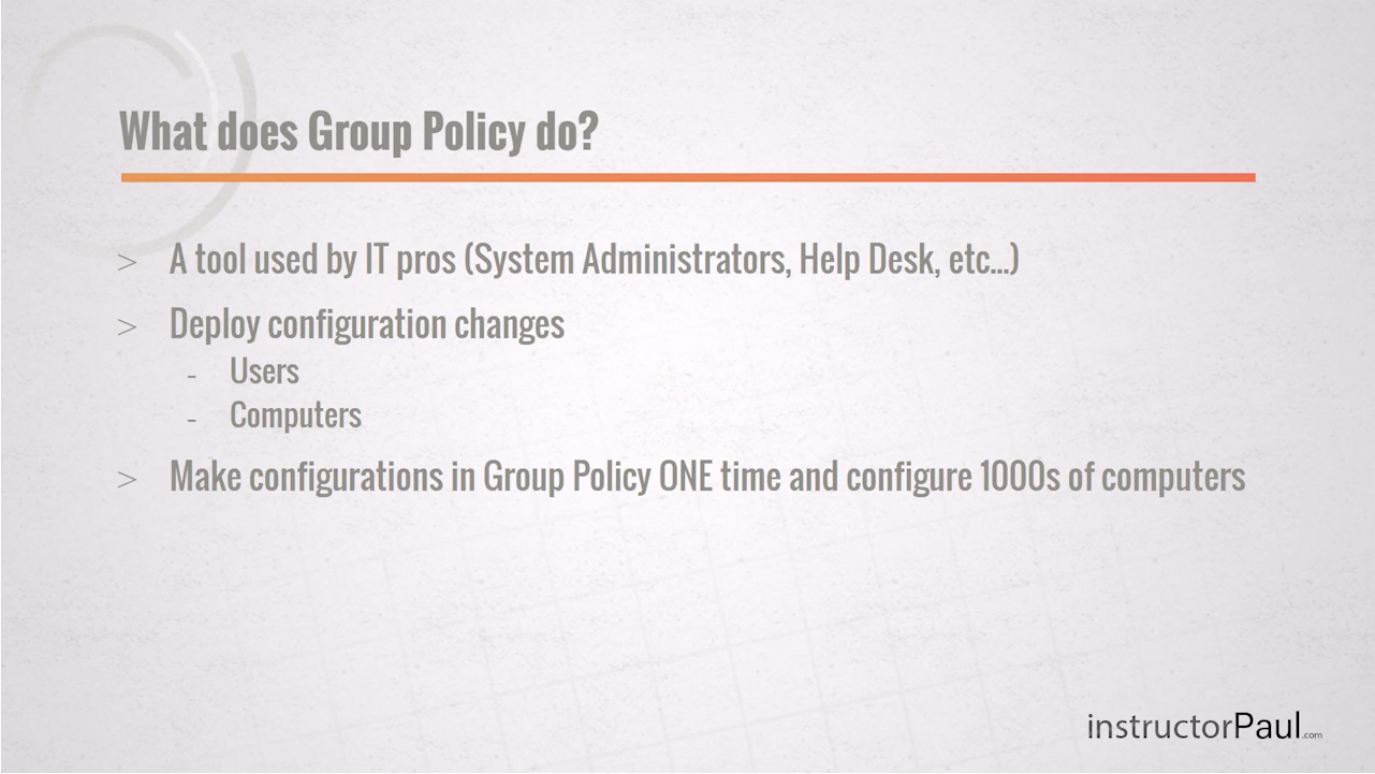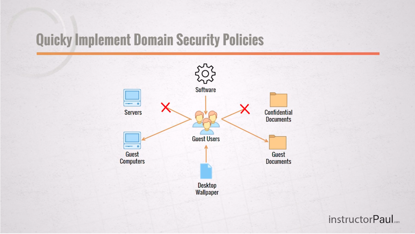 With Group Policy you can implement security configurations across your domain quickly and easily. You can do things like, restrict certain users from login into certain computers, allow only certain users to access certain files, give specific or all users a specific Desktop background, or even deploy software to certain computers within your domain.
