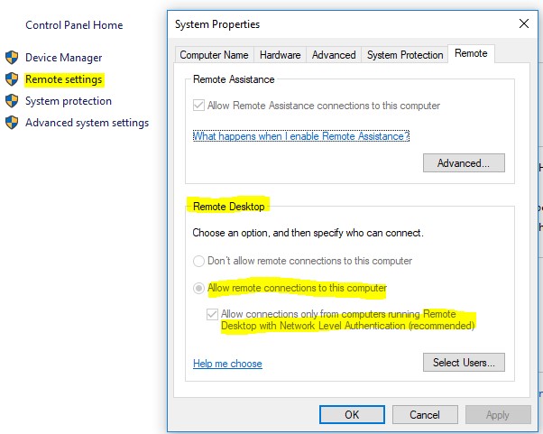 Basically, Alstud forced the remote desktop client settings to run manually on the Windows 10 computer, this enabled the remote desktop feature.