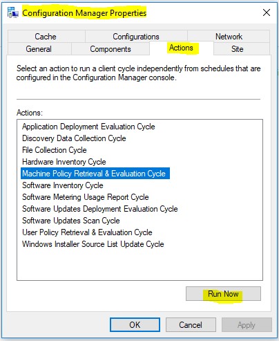 From the windows 10 computer open control panel, Configuration Manager, click Actions, click Machine Policy Retrieval & Evaluation Cycle, click run now, click ok.