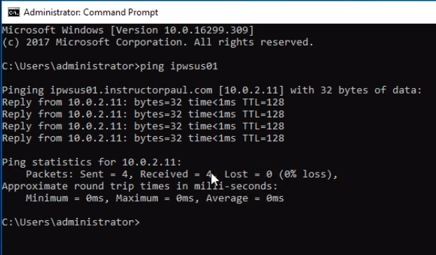 Let's do a ping and verify we have a connection to our WSUS Server.