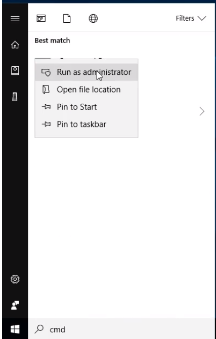 Click on the Windows icon at the bottom left and type cmd. Right-click on the Command Prompt and select Run as administrator.