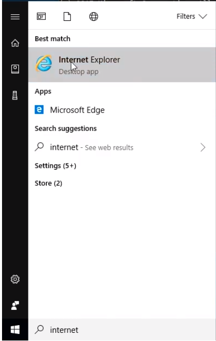 Click on the Windows icon at the bottom left and type internet and click Internet Explorer from the list.