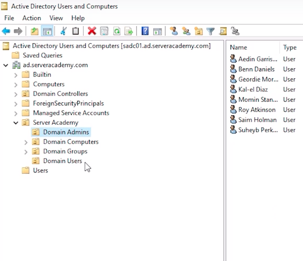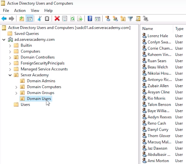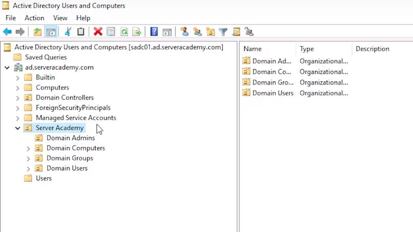 What I am going to do is expand my domain ad.serveracademy.com and I want to mention right away that it's extremely important that you create the Active Directory user account in the right location. If you created the AD user in the wrong spot that means they could get the wrong set of Group Policy security settings. So, just to explain this a little bit more, we have a full course at ServerAcademy.com for Group Policy. We are not going to get deep into it in this course, but, if I have an Organizational Unit, Server Academy, which you'll notice almost every organization has this, they'll have a Domain and then they'll have an OU that kind of mimics the same name, so I have ad.serveracademy.com. Up here is my domain and I have an OU for that where I am going to put ALL of my domain infrastructure.