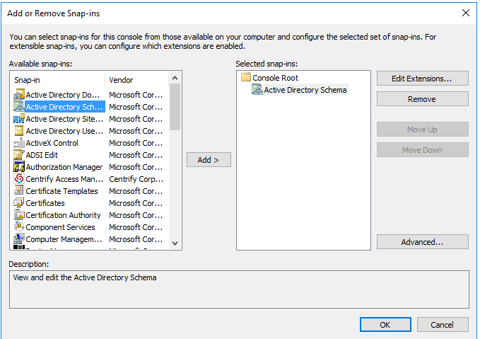 Add the Active Directory Schema snap-in, click Add, then click OK.