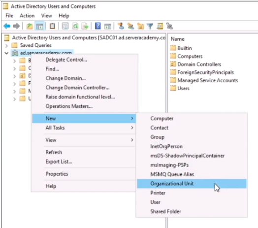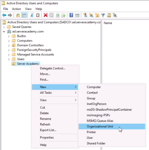 Let’s create a new OU. Right-click on ad.serveracademy.com and select from the context menu New > Organizational Unit.