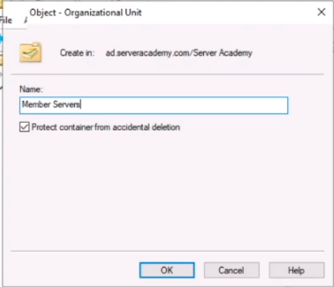 Name the OU Member Servers. This OU will be for my other Windows Server operating systems computers that are not Domain Controllers. Click OK.
