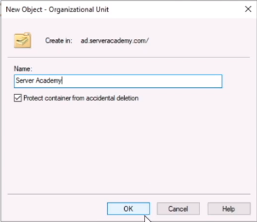 Note that we have a checkbox checked to Protect the container from accidental deletion. We definitely want to leave it checked, since if we don’t, and somebody accidentally deletes it, will wipe out our entire infrastructure of users we are about to create under this OU.