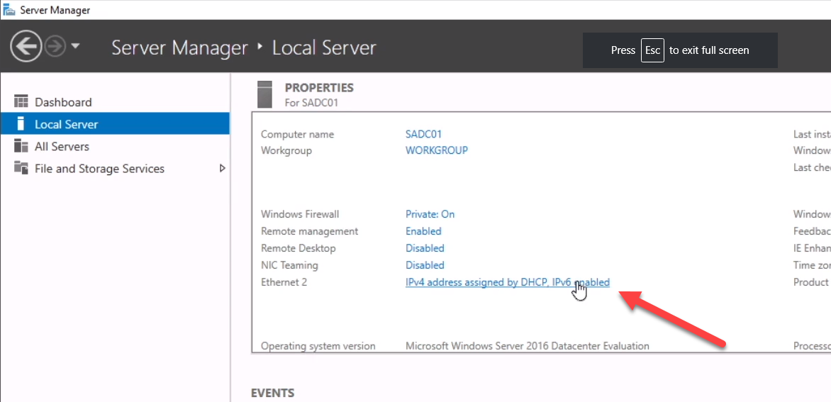 To assign a static IP address open Server Manager and click the blue text next to your ethernet adapter: