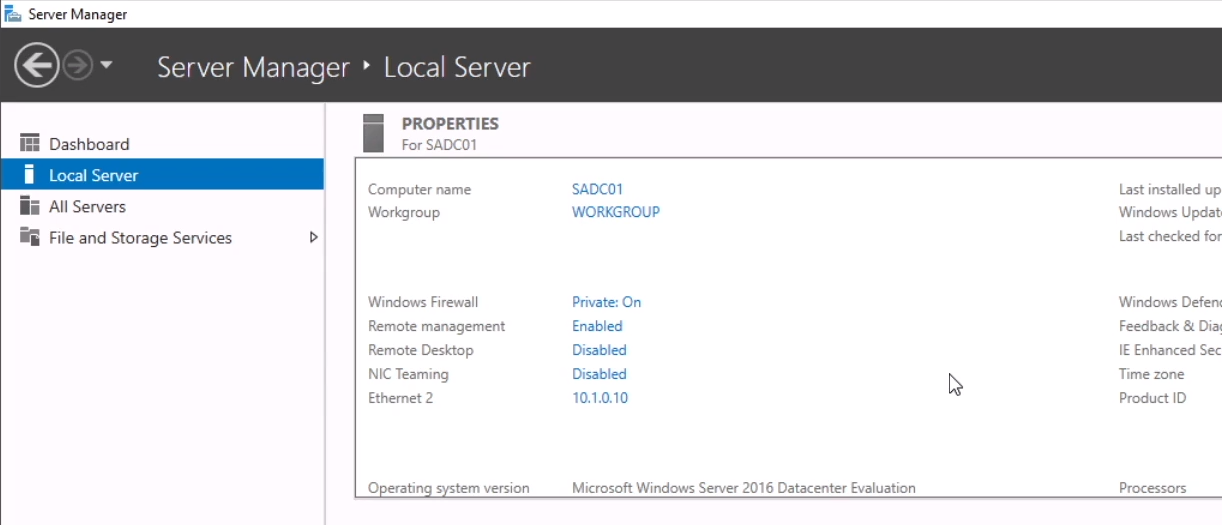 Click OK and close the network windows and dialogs. Refresh Server Manager. You should now see your static IP address assigned to your server: