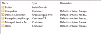 We will talk about the Containers or folders as you might call them. We will explain what they are, what they are used for so that you have a good understanding of what’s going on here.These folders are here by default and are of different types. We have one BuiltinDomain, an Organizational Unit, and some Container folders.