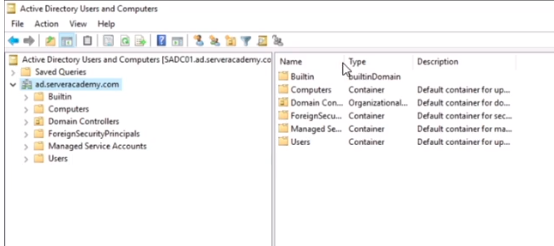 Once our console comes up we are going to see our domain name on the left pane: ad.serveracademy.com. Click to expand it to show the contents.