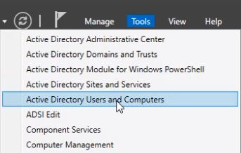 Go ahead and close the window. Now click Tools > Active Directory Users and Computers:
