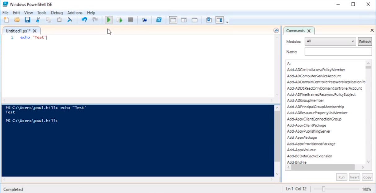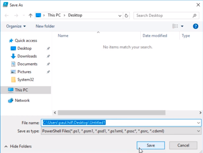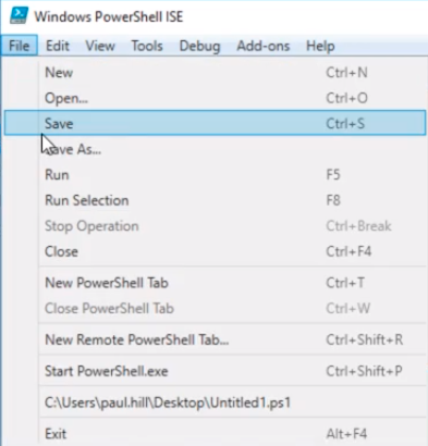 And, You’ll notice there’s a * next to the name in the tab Untitled1.ps1*. This means we have unsaved changes. So what I am going to do is save the script by clicking File > Save.