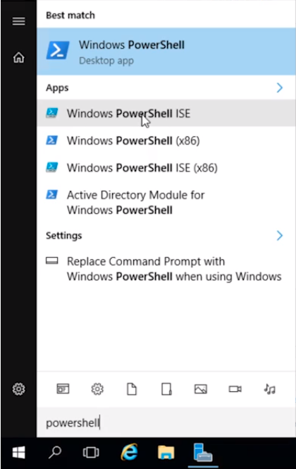 What I am going to do is open the PowerShell ISE by clicking on the lower-hand side of the screen, and I am going to type powershell. Next, I am going to select the Windows PowerShell ISE.