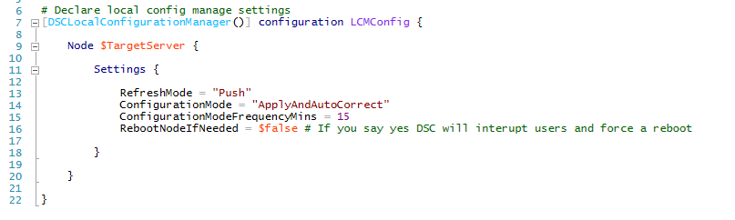 First, we are declaring the configuration object as a DSC local configuration manager object type with the [DSCLocalConfigurationManager()] attribute on line 7. Then we declare the configuration as “LCMConfig”. You can think of configurations simi…