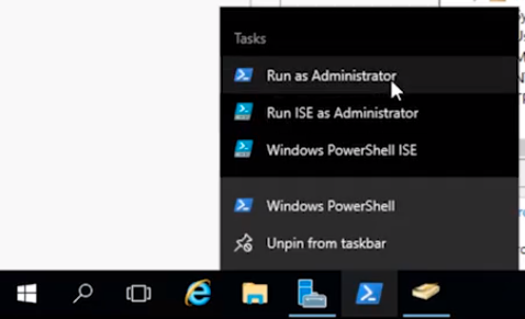 I am going to right-click on the PowerShell icon in the taskbar and make sure to select Run as Administrator.