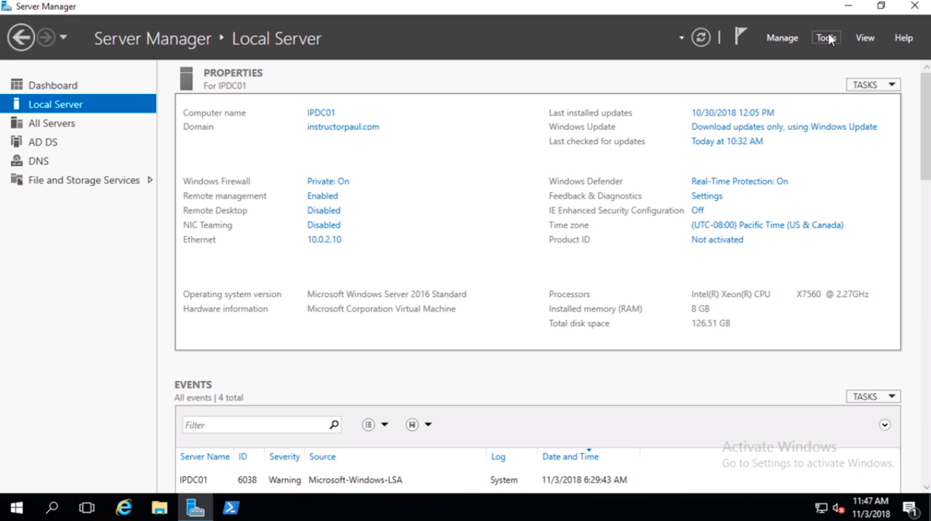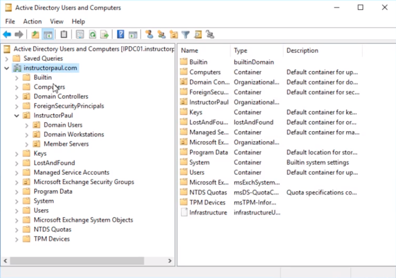 So, the first thing that I am going to do is on IPDC01 which is my Domain Controller in instructorpaul.com Domain we are going to open Active Directory Users and Computers by clicking on Server Manager > Tools > Active Directory Users and Computers.