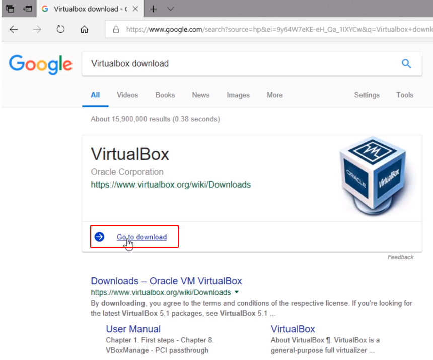 Ok, so we see VirtualBox and a link Go to download.