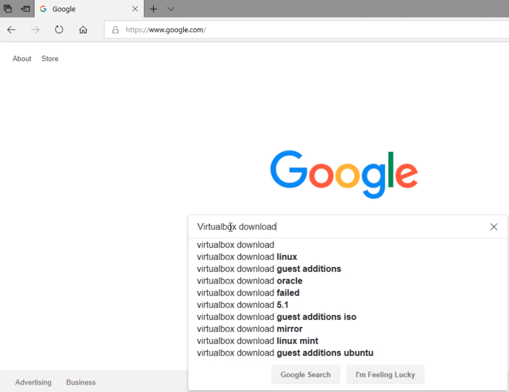 So, what we need to do is open our preferred Web Browser, and again, I am going to use Microsoft Edge, and we are going to load https://www.google.com. Once you are at https://www.google.com we are going to search for Virtualbox download and press Enter or click on the Google Search button.