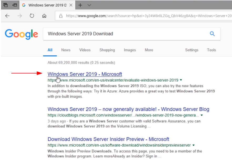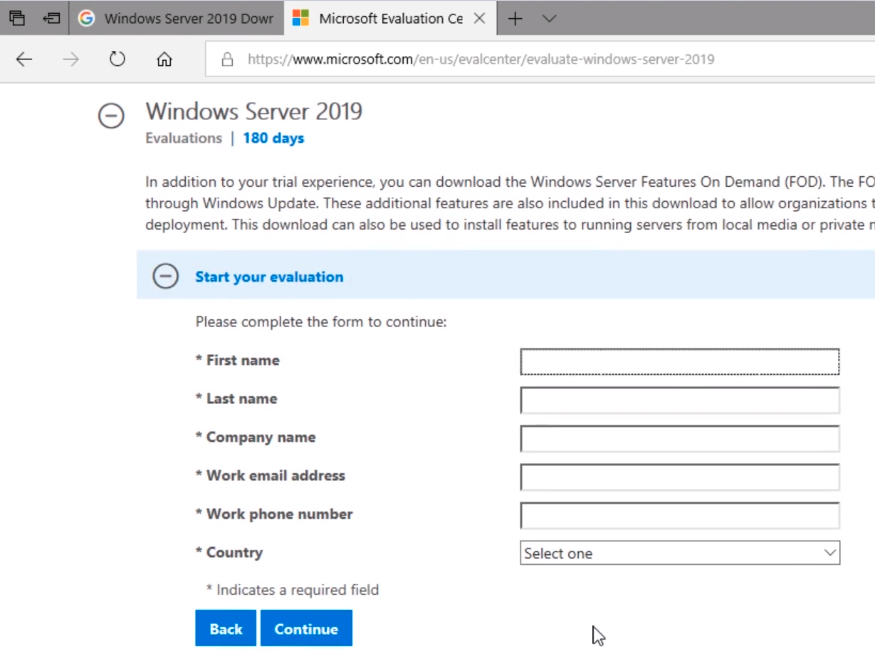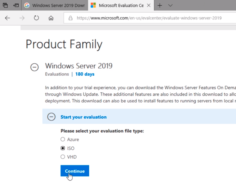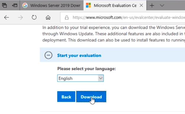 Here on the top page, we have Windows Server 2019. We can see here this link is inside the Eval Center so this tells me that this is a good idea.