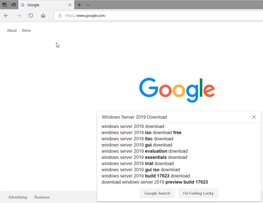 What you need to do is open your preferred Web Browser, and I am going to use Edge for this lecture, and you need to go to https://www.google.com. Now, once the page is loaded we are going to simply search for Windows Server 2019 Download and press Enter or hit the Google Search button.