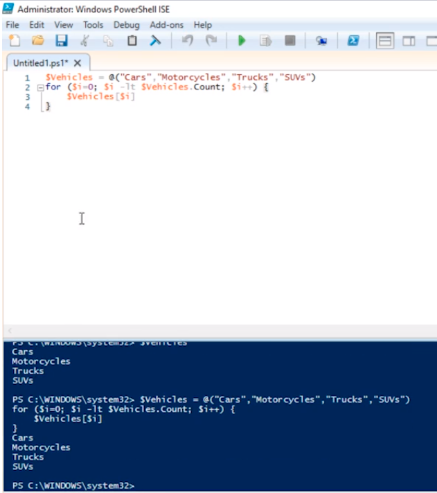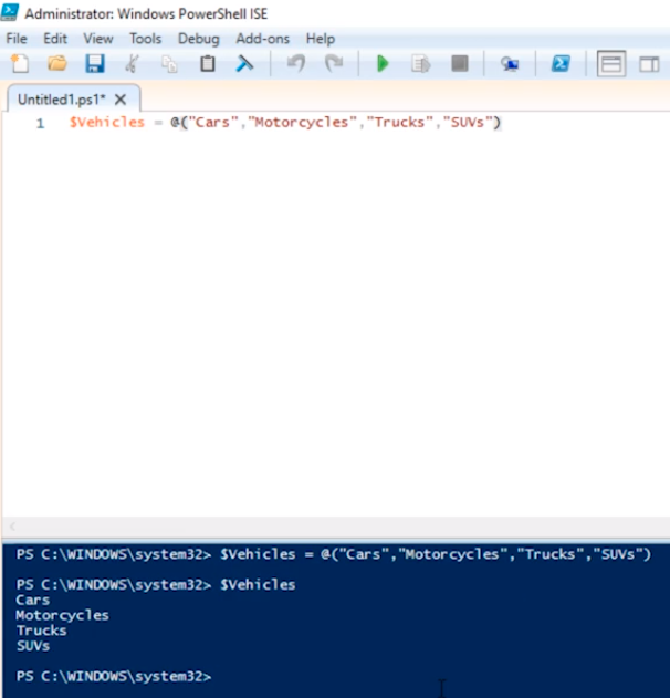 $Vehicles = @(“Cars”,”Motorcycles”,”Trucks”,”SUVs”)