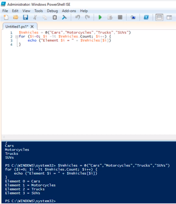 echo (“Element $i = “ + $Vehicles [$i])