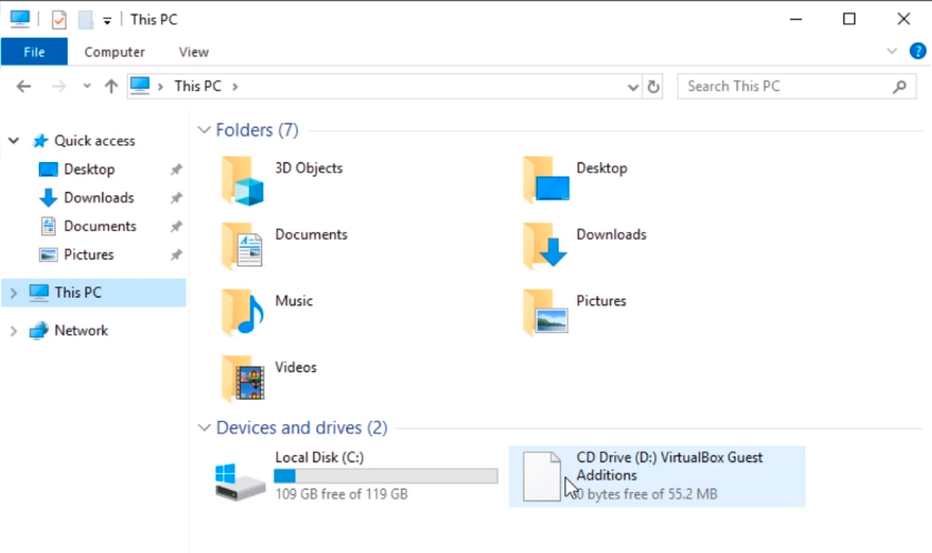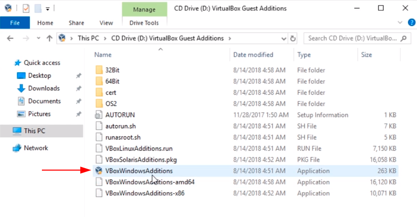 I am going to click the File Explorer down from the Taskbar and click This PC and double-click CD Drive (D:) VirtualBox Guest Additions.