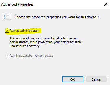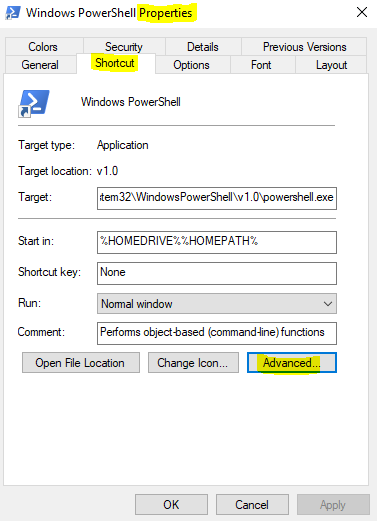 So go ahead and right click on 64 bit version of Windows PowerShell, choose pin to taskbar. Hold down the shift key, then right click on the PS icon in the taskbar, then click properties, click shortcut, then click advanced, then check run as administrator, click ok then click ok again.