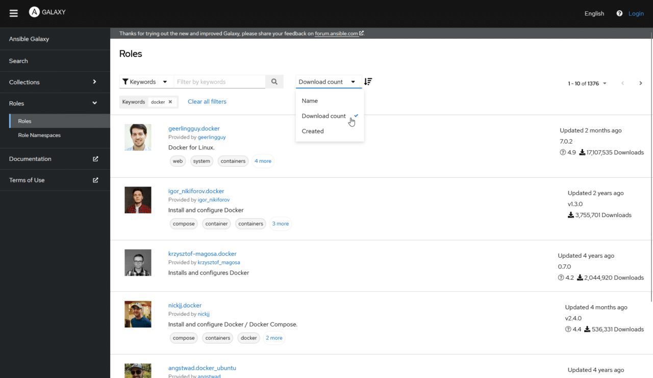 Searching Ansible Galaxy Roles for Docker