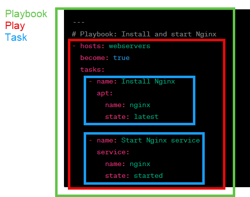 - Tasks: The operations (or actions) performed by Ansible, usually through Ansible modules.