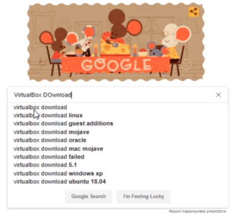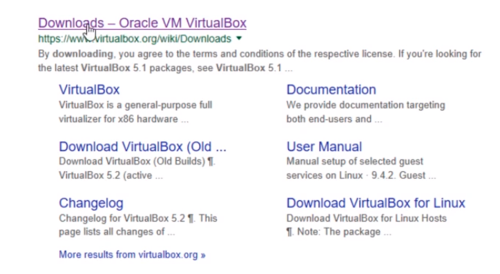 From the search results select the Downloads - Oracle VM VirtualBox link that reads https://www.virtualbox.org/wiki/Downloads.