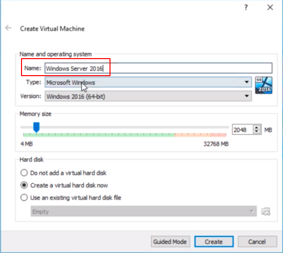First, we are going to select a name for the Virtual Machine and we will call this one Windows Server 2016.