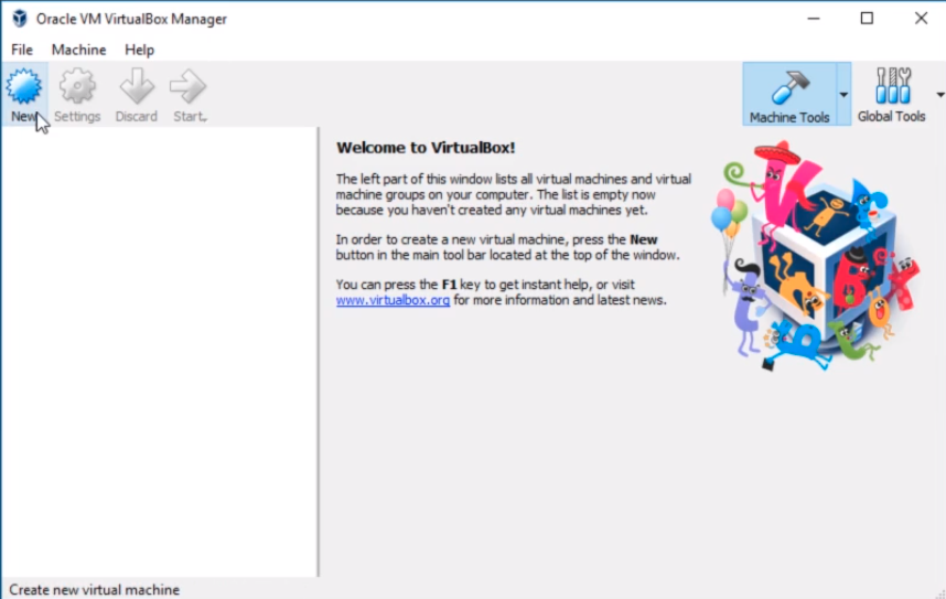 I have the Oracle VM VirtualBox Manager application open and what I am going to do is just click on New on the top left-hand corner.