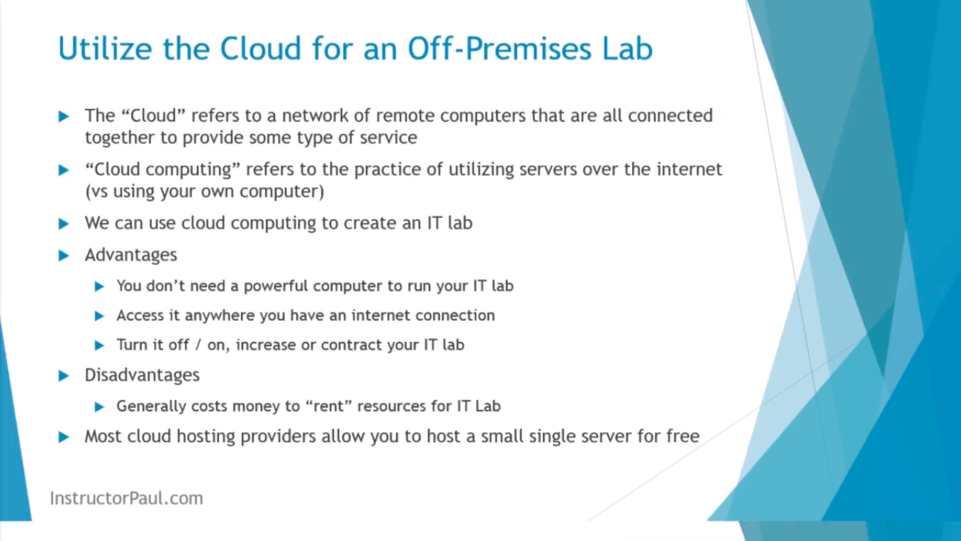 You don’t need a powerful computer to run your own IT Lab. Some of you might not have a 64-bit computer or you can’t run Windows Server on your laptop or computer just because it is too slow. This is where the Cloud, or using the Internet, or resources over the Internet can be a huge advantage because it can allow you to run your IT Lab.