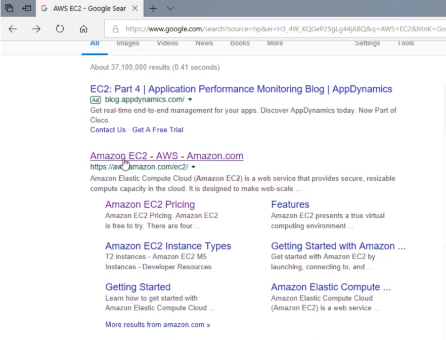 I am going to click on the first link that takes me to https://aws.amazon.com/ec2/.