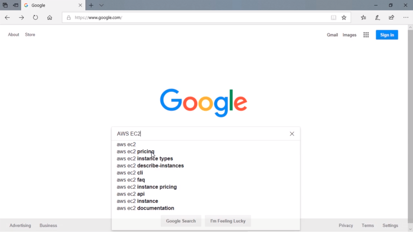 Here I am at https://www.google.com. What I am going to do is I am going to Google for AWS EC2 and press Enter.