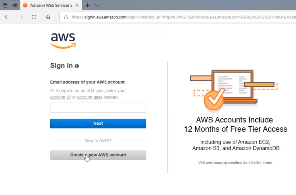 And, from the next page, I am going to create a New AWS Account because I do not have one already.