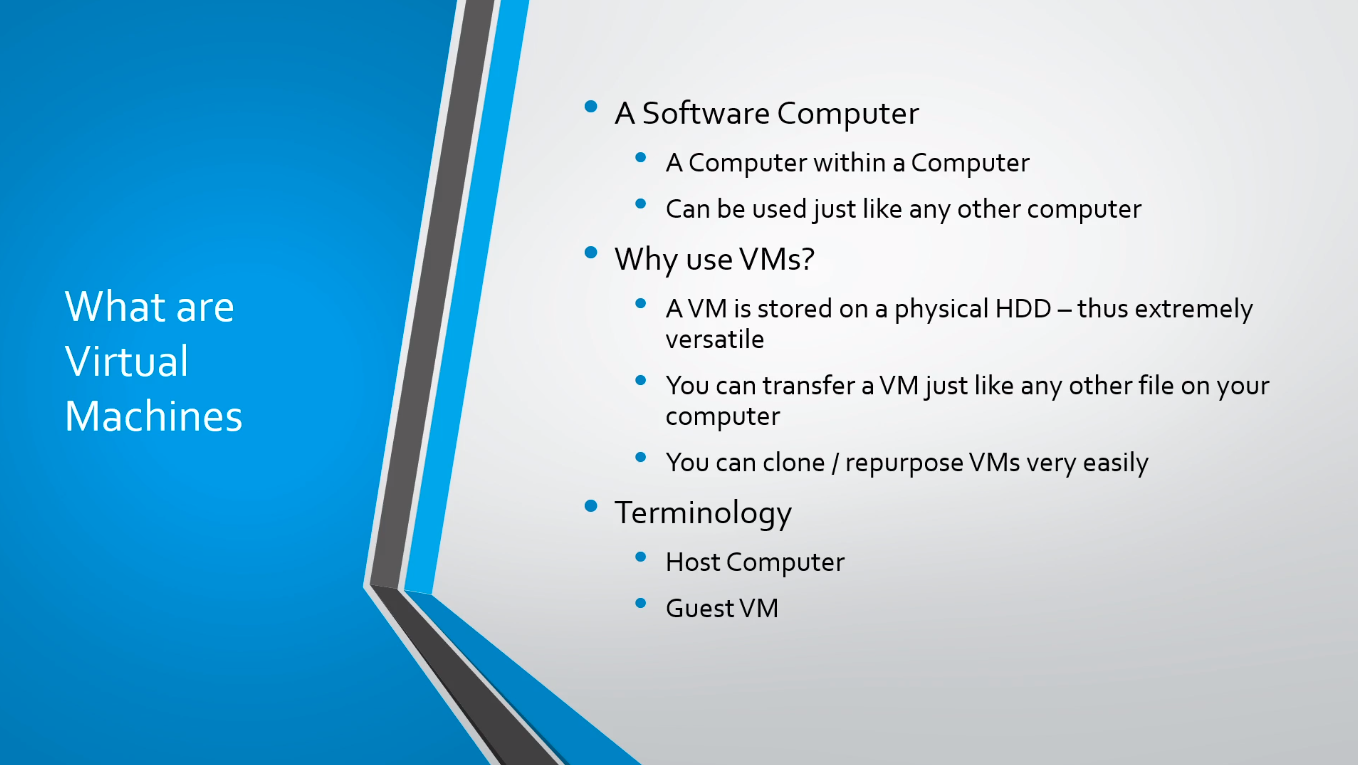 So you might ask, why would you want to use a Virtual Machine? Well, VMs are stored in a physical Hard Disk drive, which means they are extremely versatile, you can transfer them just like any other file on your computer.